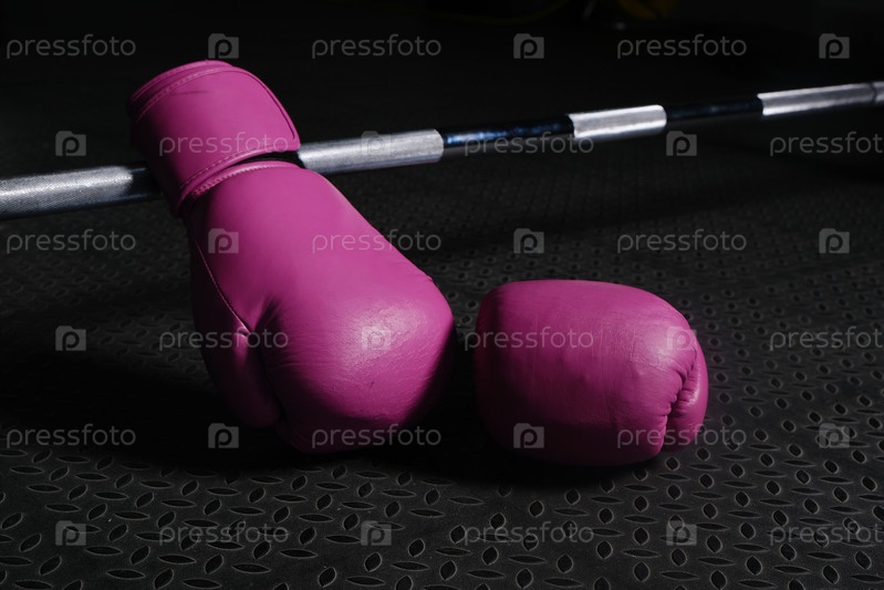 Розовые боксерские перчатки лежат на полу рядом с штангой