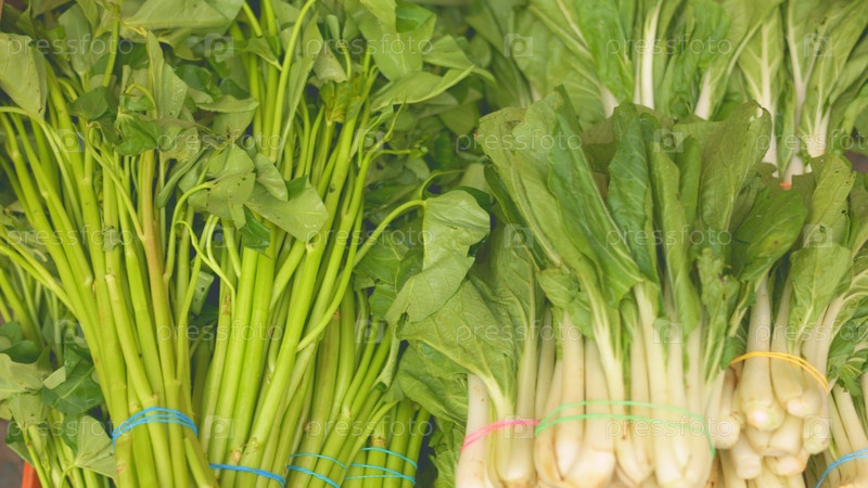 Свежие зеленые пучки от рыночного повара, выбирающего нежные бокчои и стебли шпината, привязанные к аккуратным пучкам с резиновыми лентами, росовые листья и земной аромат идеально подходят для жарки и выращивания на столовых меню
