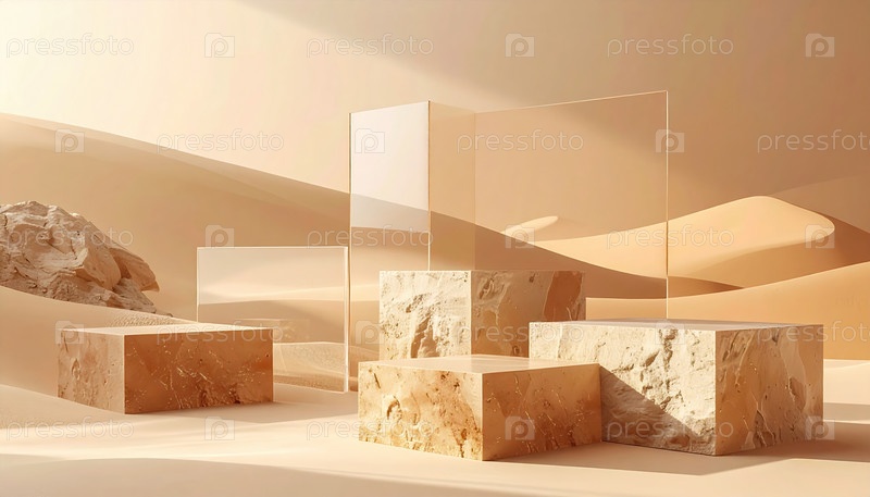 Минималистическая композиция из каменных и стеклянных блоков в золотистом пустынном пейзаже, показывающем контраст природы и эстетику современного дизайна