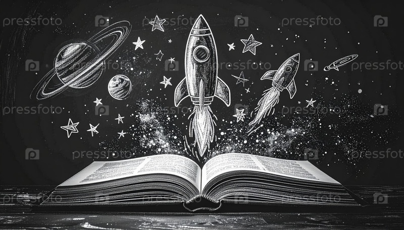 Открытая книга с ракетами и планетами, нарисованная мелом, символизирующая воображение, формирование творческих знаний и безграничный потенциал изучения Вселенной
