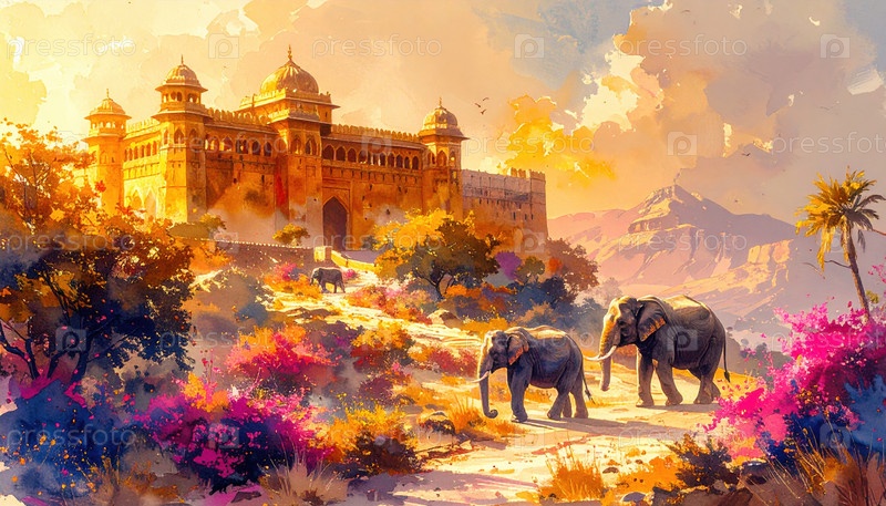 Акварельная живопись слонов, идущих рядом с золотым фортом в Индии на закате солнца, символизирующая наследие, силу и приключения экзотических туристических направлений