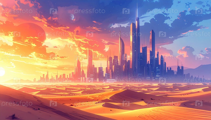 Футуристический пустынный город на рассвете символизирует инновации, возникающие из бесплодной земли и может иллюстрировать климатическое видение, техническую утопию или будущие тенденции расширения городов