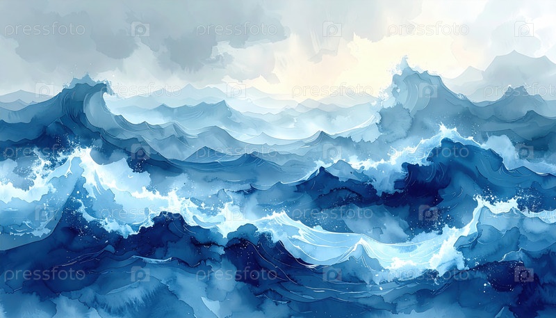 Динамичный акварель бурных голубых океанских волн, символизирующих силу, свободу, эмоции и силу природы, идеально подходит для концепций энергии и вызова