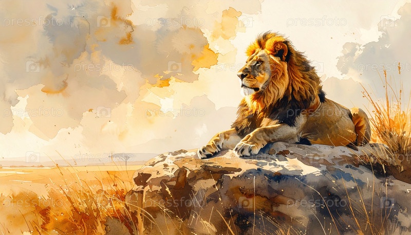 Королевский лев, отдыхающий на скале в золотистом саваннном свете, символизирует силу, лидерство и величие африканской дикой природы