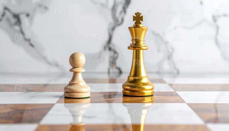 Шахматная фигура золотого короля, стоящая рядом с деревянной пешкой, символизирует лидерство, амбиции и путь от скромного начала к успеху