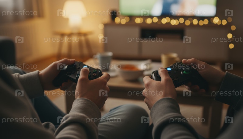 Вечерняя игровая сессия соединяет двух друзей в уютной гостиной с теплым сказочным светом и общим фокусом на экране