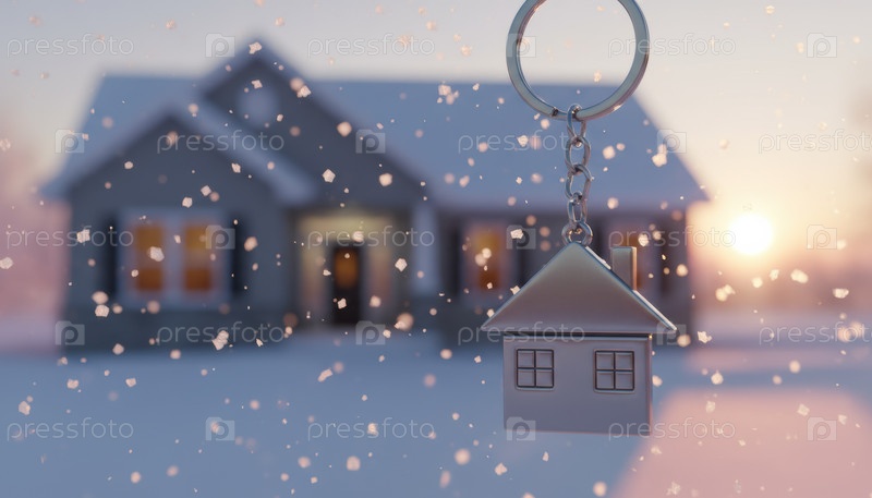 Дом в форме цепи под ключ удерживается на падающем снегу перед уютным домом при закате солнца, провоцируя первые покупки жилья, истории зимнего переезда и долгосрочные мечты о безопасности