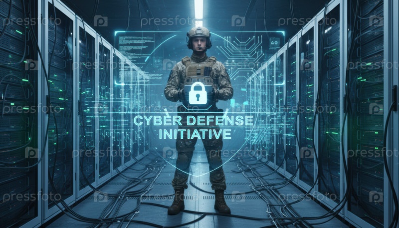 Солдат в центре обработки данных стоит перед голограммным щитом, концепцией национальной киберзащиты, цифровой войны, защиты данных и обеспечения безопасности критической инфраструктуры