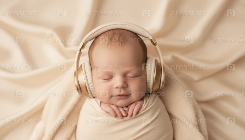 Спящий новорожденный, завернутый в бежевое одеяло с большими наушниками, символом тихого воспитания детей, плейлистом колыбельной песни и ранней любовью к расслабляющей музыке дома