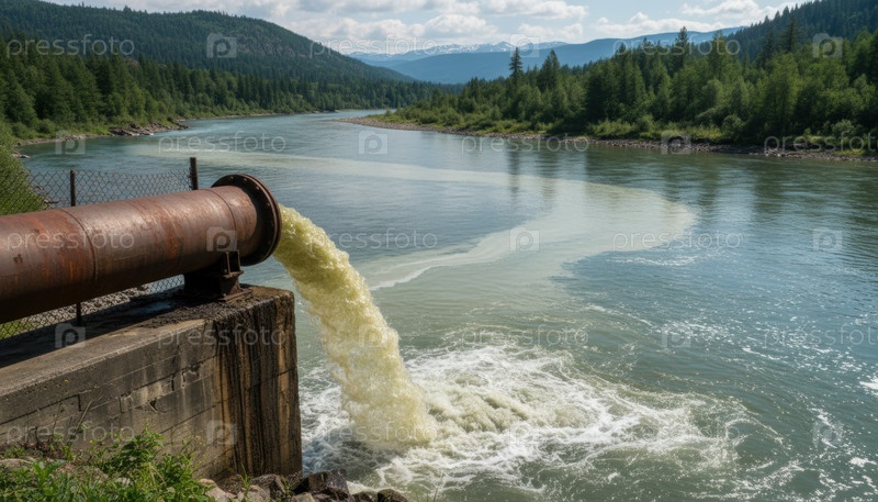 Промышленные трубы разливают загрязненную воду в горную реку, предупреждая о климатическом кризисе, повреждении экосистем и необходимости защиты чистой воды в Канаде или Норвегии