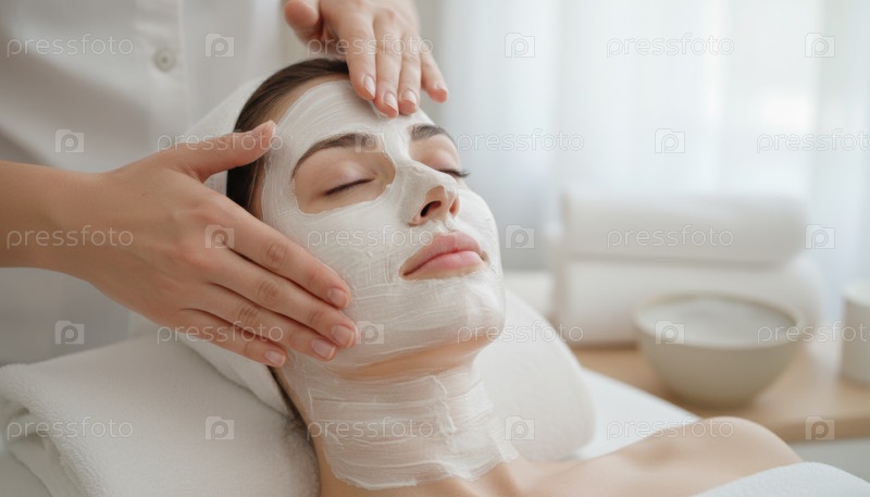 Женщина расслабляется в спа-салоне, когда терапевт гладит белую маску на ее коже и шее.Концепция лечения красоты, ритуала самообслуживания и профессионального оздоровления