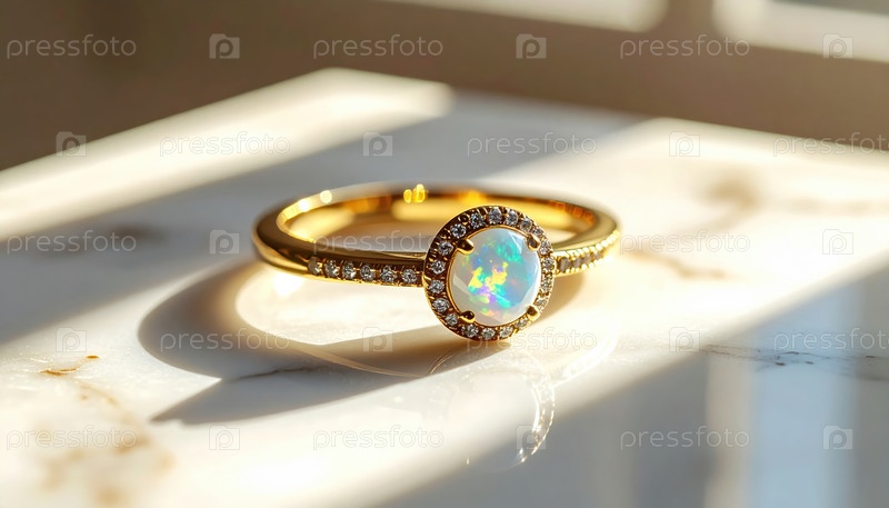 Опальное ореоловое кольцо, светящееся теплым солнечным светом на мраморной поверхности, является символом помолвки, нового начала, трендом роскошных подарков и устойчивых ювелирных изделий