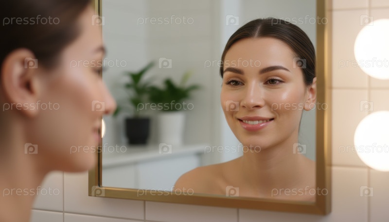 Женщина улыбается своему отражению в ярком зеркале ванной комнаты, символизируя уверенность в себе и позитивное отношение