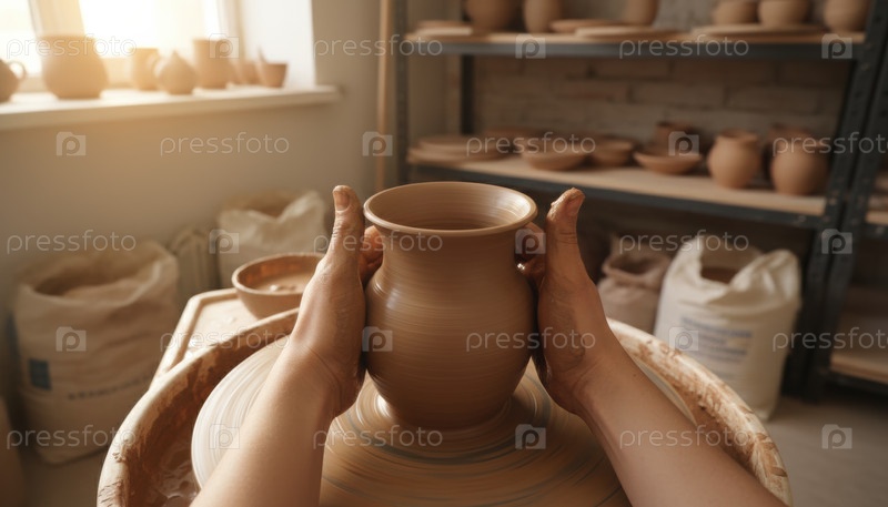 Руки, формирующие глиняную вазу в керамической студии, символизируют традицию творческого мастерства, сознательного труда и художественного выражения