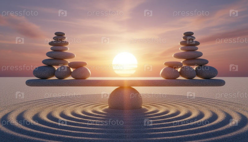 Скульптура с уравновешенным каменным стеклом над спокойными волнами песка на закате, символическое изображение Дзен для баланса между работой и личной жизнью, медитативного отдыха и осознанности