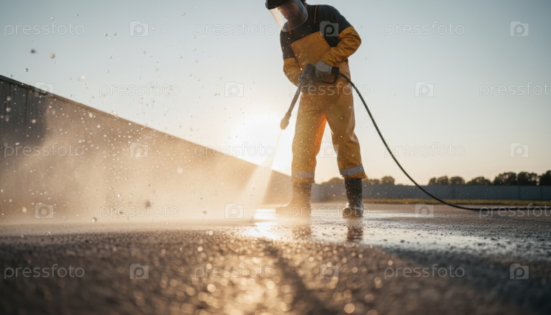 Работник, использующий струю воды под высоким давлением во время восхода солнца, символизируя протокол безопасности промышленной чистки на открытом воздухе и современный труд