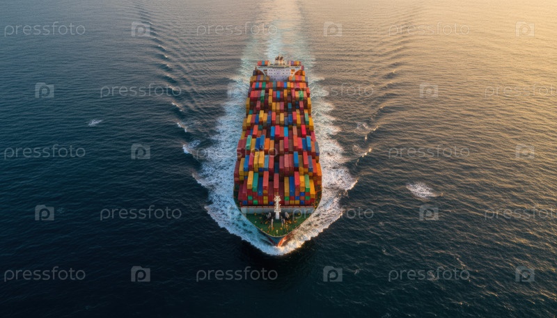 Красочные контейнеровозы, плавающие на рассвете по спокойным открытым морям, иллюстрируют глобальные торговые логистические экспортные маршруты и морские цепочки поставок