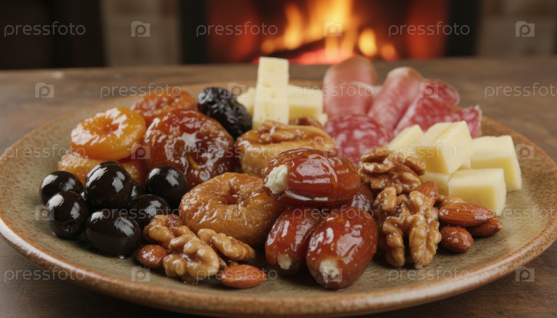 Тарелка из орехов, сыра и сухофруктов в теплой атмосфере, напоминающей традиции, гостеприимство и сезонную еду