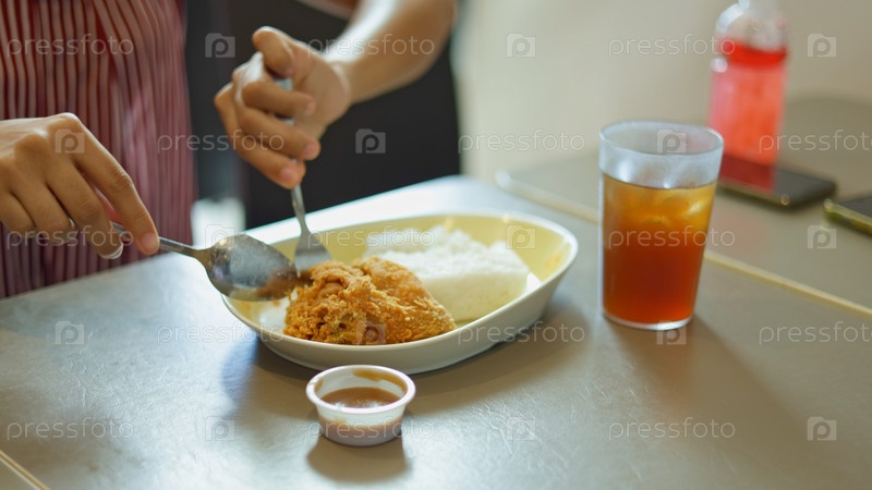 Пищевой блоггер пробует социальный контент цыпленочный рис, пищевый блогер ложку куриного рисового соуса ближайший план, ледяной чай на столе с энергией руки, создает волнение, большой влиятельный человек сталкивается с вирусными проблемами питания