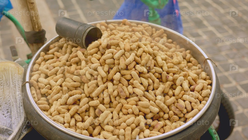 Экспозиция презентации арахиса, золотые оболочки арахисов на рынке, теплый аромат жареного арахиса в рыночных условиях, обжаренные фруктовые кластеры в деревенской пещерной среде