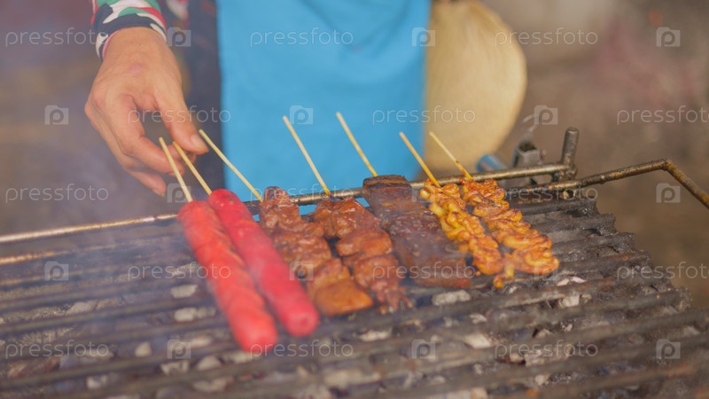 Ночной гриль на рынке, бастинг шампуней в атмосфере фестиваля, шеф-повар переворачивает шампуни над горящими углями на ночном рынке, азиатский продавец в соломенной шляпе стремится к мясу на открытом огне на фестивальном стенде