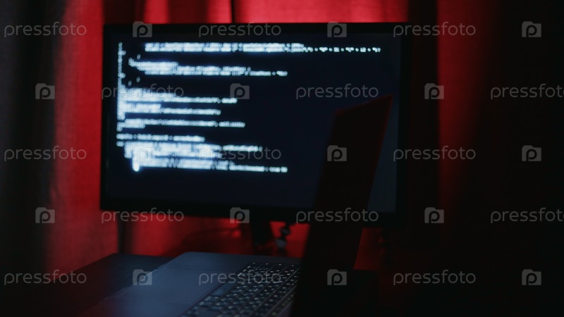 Мониторный код отображается капризным красным освещением, одна рабочая станция показывает терминальные линии и сфокусированный интерфейс, тихая ИТ-атмосфера, силуэт темного стола, производительность и концентрация вибрации IT