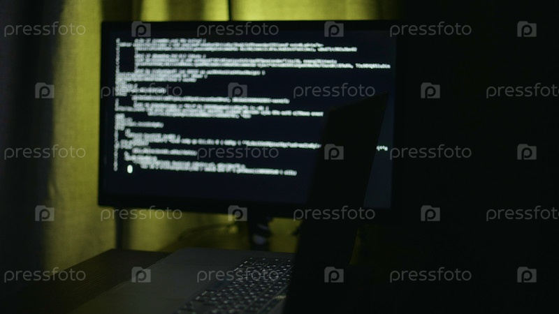 Яркое экрановое кодирование, разработчик, работающий допоздна за столом, основатель ИТ-стартапа, изучающего прототип с концентрацией, ночная сцена программиста, интенсивно просматривающего итерации продуктов в уютном рабочем пространстве