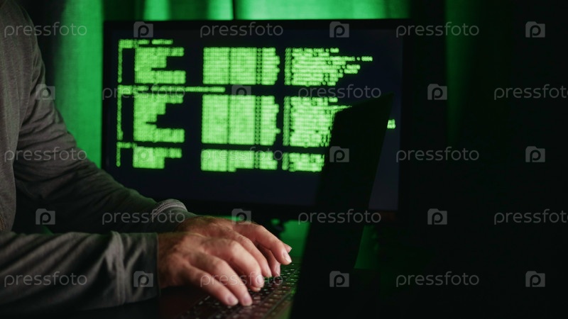 Написывая на компьютере во время расследования, технический специалист Calm IT работает над цифровым освещением дисплея безопасности, специальный профессионал взаимодействует с монитором, отображающим таинственный код при устранении неполадок