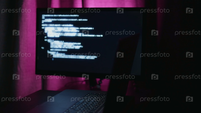 Код под фиолетовым светом, ночной программист с спокойной атмосферой, одна кодирующая среда освещена в фиолетовом цвете, тихий ИТ-вечер, посвященный целенаправленным задачам кодирования и творческому отладке