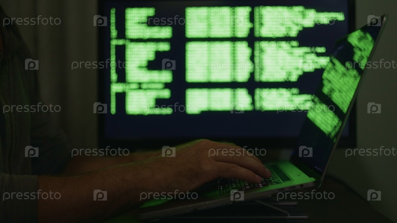 Технический аналитик следит за цифровыми системами ночью, технический аналитик изучает зеленый матричный код на неоновом светящемся экране, технический аналитик работает в темной комнате, подходит для контента корпоративных технологических проектов
