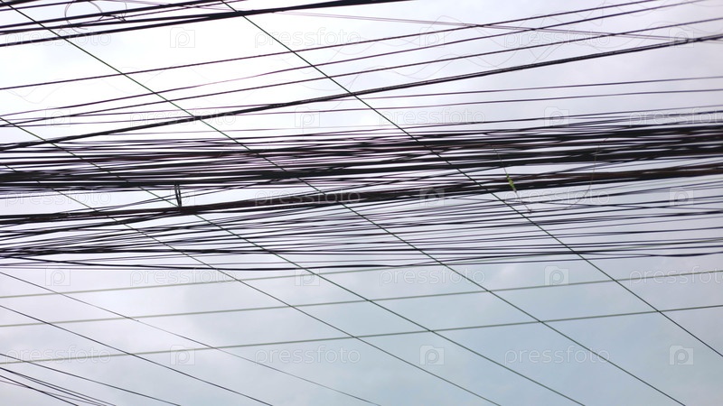 Хаотичные городские линии электропередач простираются по облачному небу, линии электричества создают беспорядочную сеть, линии символизируют перегрузку города