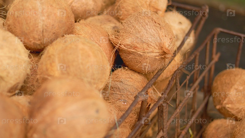 Демонстрация кустарных кокосовых орехов, кокосов на деревенском рынке, рукодельные кокосы вызывают традиционную атмосферу продуктового киоска, показывая кокосы с рустическим шармом и мастерством