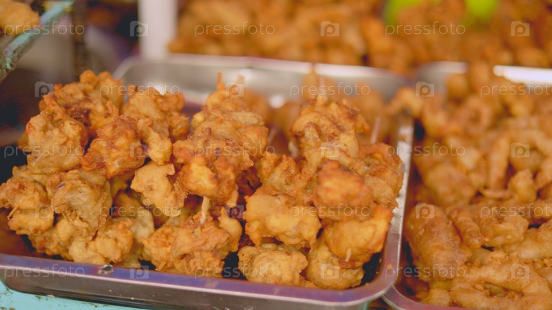 Хрустящие куриные укусы, продавец, представляющий свежеприготовленную попкорн-курицу, крупный план хрустящей попкорн-курицы, подаваемой клиентам, восхитительно хрустящая попкорн-куриная закуска, подаваемая горячей для жадных