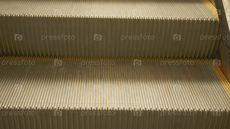 Износленные ступени эскалаторов в торговом центре, слабо освещенный эскалатор с текстурированными ступенями, крупнометражный снимок стареющих этажей эскалатора со знаками безопасности, подробный обзор металлических ступеней эскалаторов в оживлённой среде