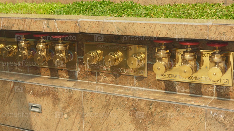 Детальное металлическое соединение, крупный план системы латунистых клапанов, мраморный фасад демонстрирует медную стойку с несколькими выходами, городской предохранитель с бронзовыми клапанами на мраморной внешней поверхности
