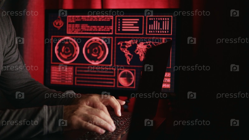 Игрок играет на клавиатуре, а затем встаёт с компьютера, на котором он играл. Слабо освещенная сцена с красной графикой на мониторе. Концепция компьютерного геймера и компьютерных игр в темной комнате с красным светом