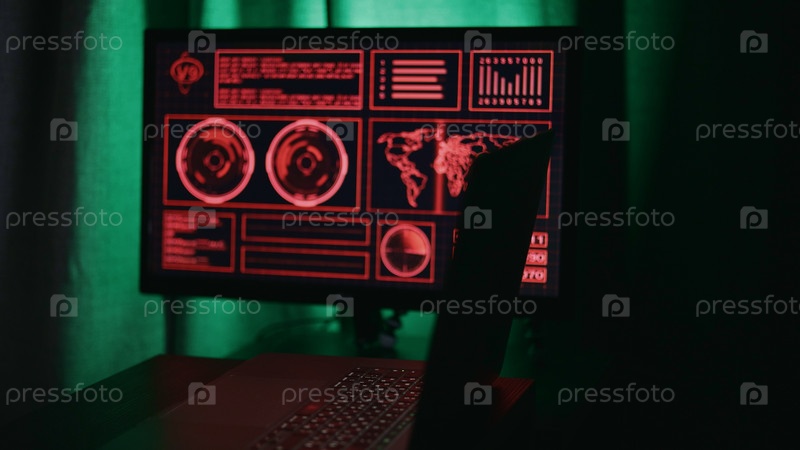 Мониторинг угроз, ноутбук с видимым дисплеем безопасности, Тёмная комната с активным интерфейсом угрозы, экран освещен предупреждениями об угрозах и ситуационными перекрытиями в фокусированной среде