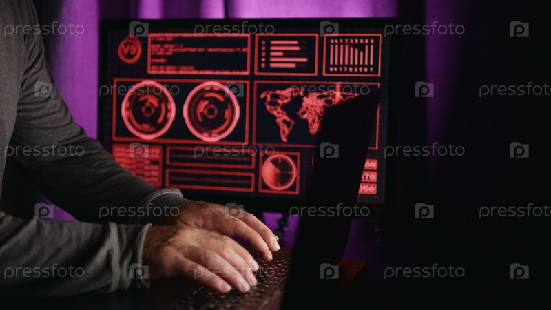 Ноутбук монитор опасности пальцы работают на срочной приборной панели Фиолетовый свет окружающей среды освещает критическую сессию анализа графиков Детальный взгляд на движения пальцев на приборной панели среди фиолетового освещения у кровати