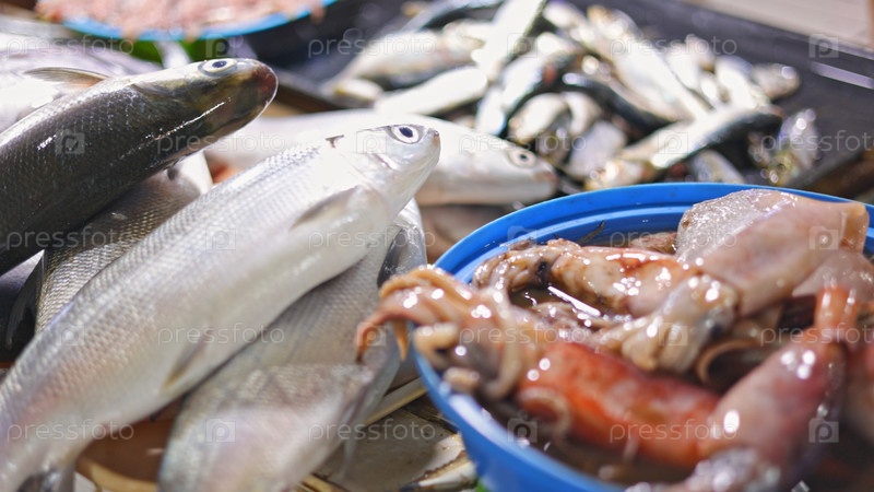 Pan на экран кальмаров, за которым следует небольшой ряд рыбного рынка, дисплей показывает свежий ряд морепродуктов с различными питательными веществами, яркую сцену ассортимента рыбы, момент еды, подходящие объявления о здоровых продуктах