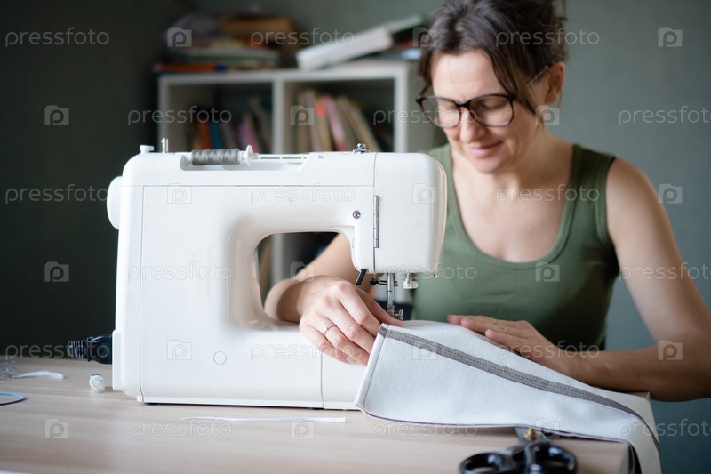 Удовлетворенная женщина шиет в машине на мастерской