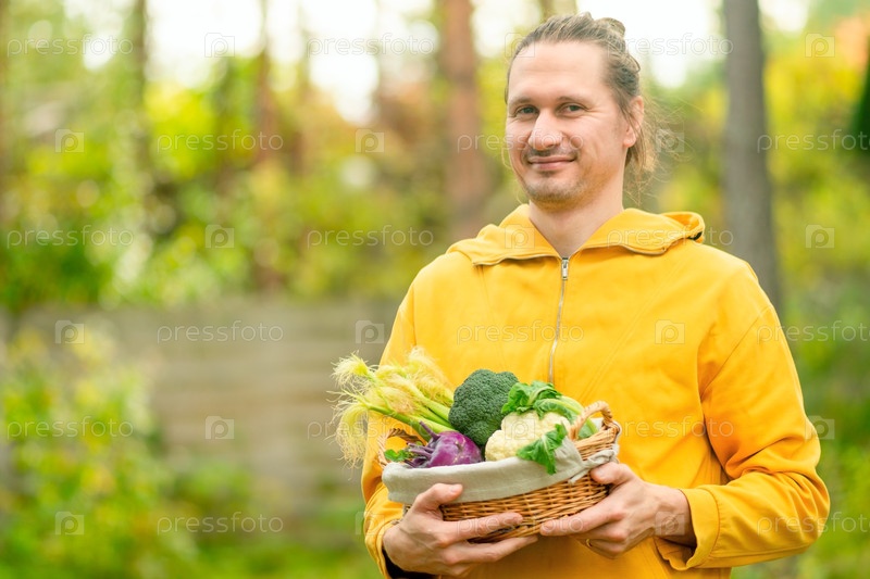 Гордый фермер с корзиной кукурузных брокколи, цветной капусты и кохраби