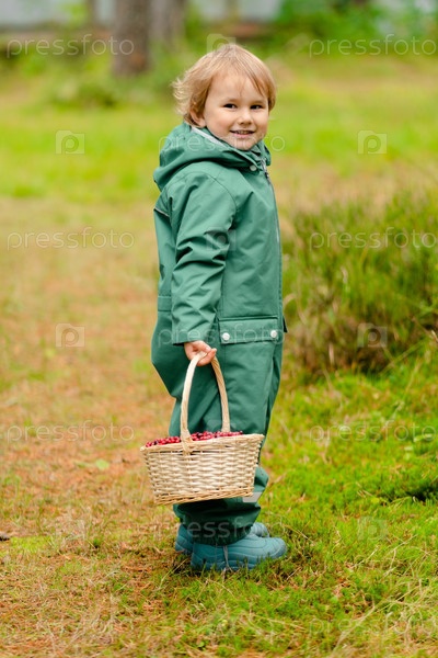 Малыш подбирает клюквы в корзине во время осенней прогулки