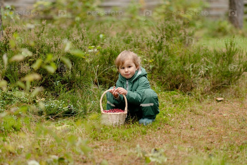 Маленький мальчик в водонепроницаемых мембранных комбинезонах и резиновых сапогах сидит в осеннем лесу с корзиной клюквы, защитой от клещей и двигательной активностью