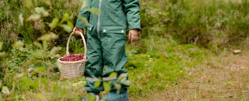 Маленький мальчик, стоящий в осеннем лесу с корзиной клюквы