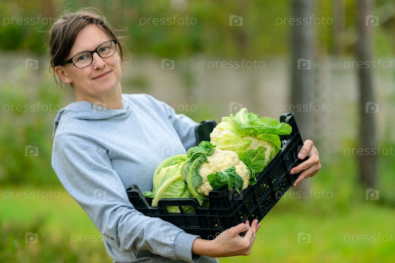 Женщина-фермерка с гордостью демонстрирует коробочку для выращивания цветной капусты