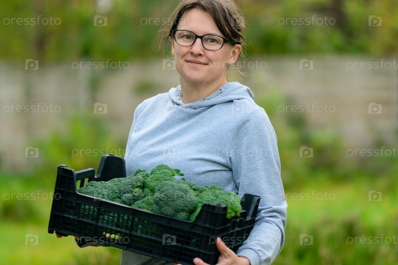 Фермерка держит деревянную коробку с урожаем органического брокколи