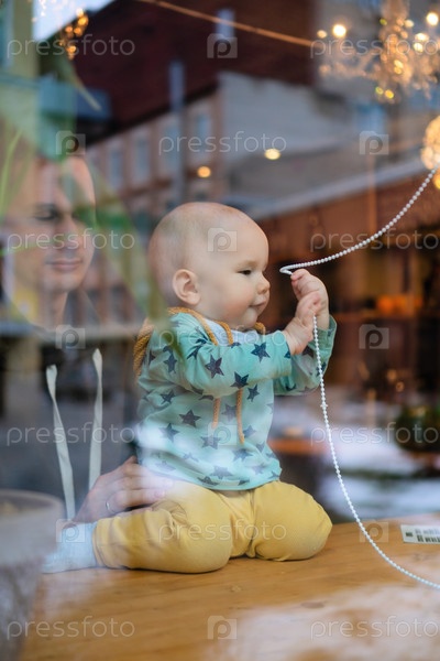 Родитель, держащий маленького ребенка в кафе, был замечен с улицы через окно.Семейные узы, родительская любовь, доверие и повседневное счастье в современном общественном пространстве, теплая заботливая атмосфера
