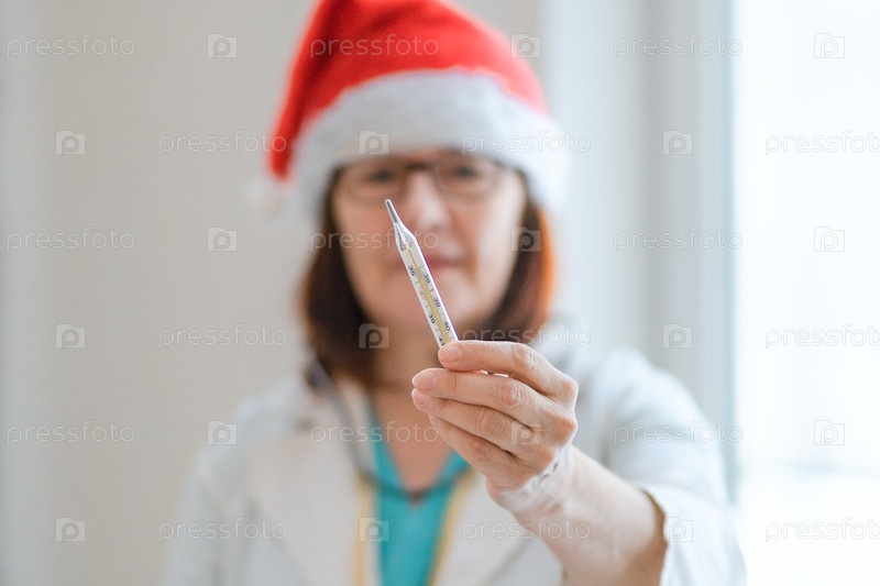 Доктор Санта-Хэт держит термометр в больнице