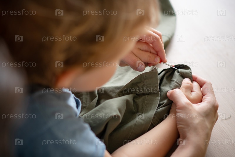Мать и ребенок занимаются домашним проектом по пошиву, вместе снимая швы на паре брюк. сверху вниз, семейное ремесло