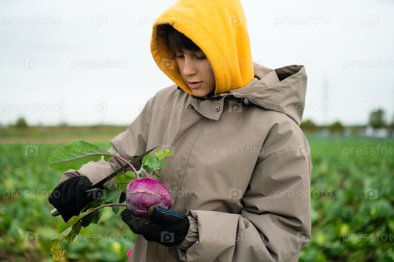 Молодой мальчик-фермер собирает красные и фиолетовые колрабы, режет листья ножом, свежие сезонные овощи, домашние продукты, гордость фермы, здоровую пищу и работу на открытом воздухе в природе